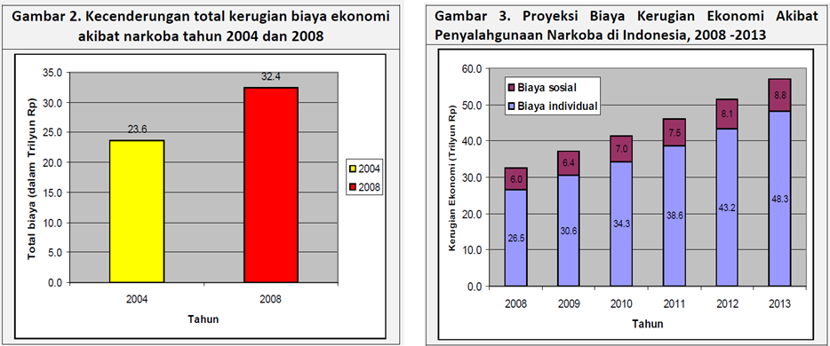 Di Indonesia, kerugian diperkirakan Rp.23,6 trilyun atau $2,6 milyar pada tahun 2004 (BNN & Puslitkes UI, 2005). Temuan Tim Peneliti Pusat Penelitian Kesehatan Universitas Indonesia menyimpulkan kenaikan jumlah penyalahguna dan kerugian biaya ekonomi penyalahgunaan NAPZA. Jumlah penyalahguna diperkirakan sekitar 3,1 juta sampai 3,6 juta orang di Indonesia tahun 2008 atau sekitar 1.99% dari total populasi beresiko terpapar narkoba di Indonesia.