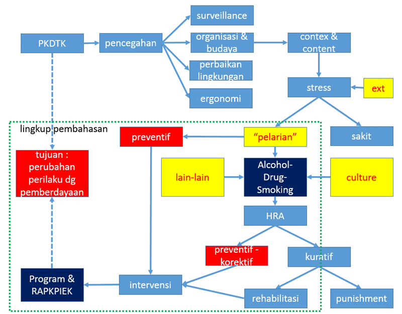 Konsumsi alkohol, obat terlarang dan merokok merupakan salah satu “pelarian” yang diakibatkan oleh stress ditempat kerja, meskipun ada faktor pemungkin lain misalnya stress dari masalah keluarga. Pendekatan PKDTK yang pertama disini bersifat preventif, yaitu untuk mencegah/mengeliminir “pelarian” sehingga menjadi kegiatan yang positif.Stress ditempat kerja salah satunya diakibatkan karena tidak sesuainya job content dan job contex, dimana pengaturan/organisasi dan budaya perusahaan seharusnya di desain sedemikian rupa untuk dapat mencegah sakit – penyakit termasuk stress.