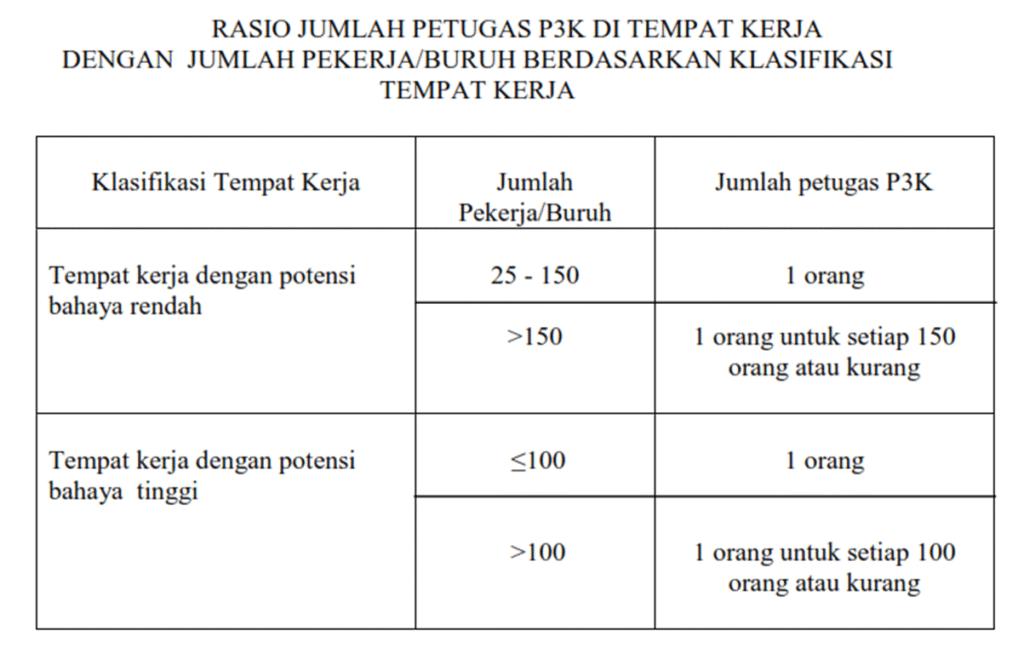 Petugas P3K dalam melaksanakan tugasnya dapat meninggalkan pekerjaan utamanya untuk memberikan pertolongan bagi pekerja/buruh dan/atau orang lain yang mengalami sakit atau cidera di tempat kerja. Petugas P3K di tempat kerja ditentukan berdasarkan jumlah pekerja/buruh dan potensi bahaya di tempat kerja (dengan rasio sebagaimana Lampiran I Peraturan ini.