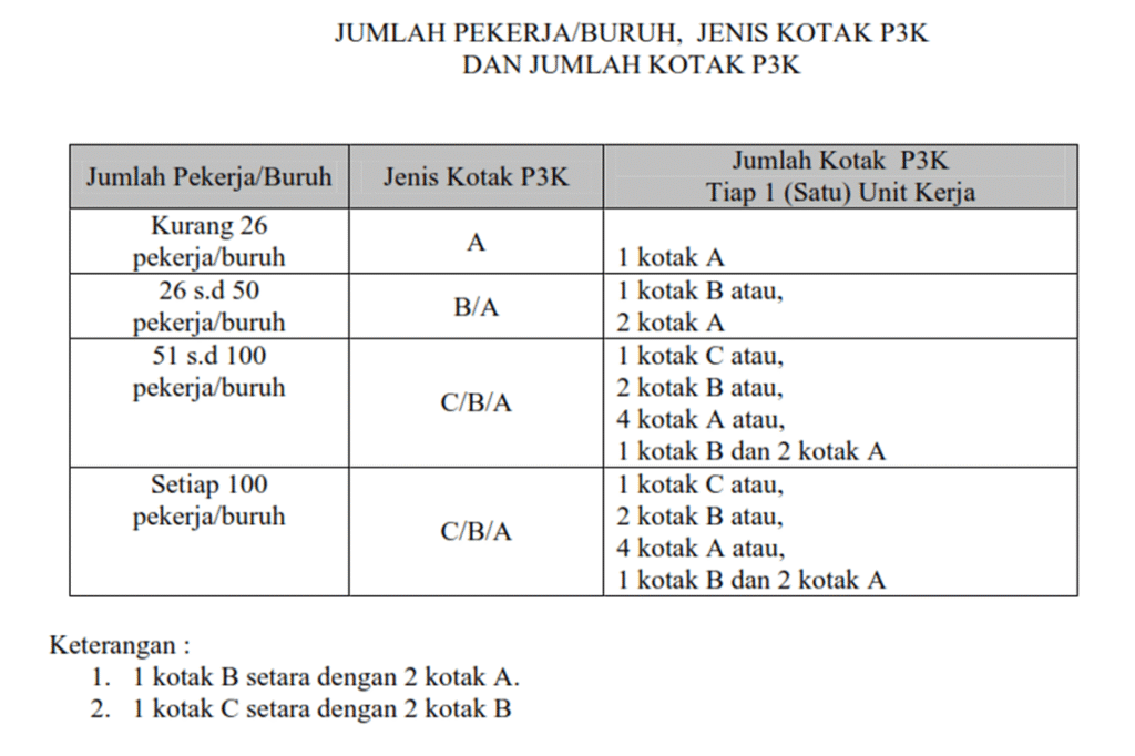 - disesuaikan dengan jumlah pekerja/buruh, jenis dan jumlah kotak P3K sebagaimana tercantum dalam Lampiran III Peraturan Menteri ini;