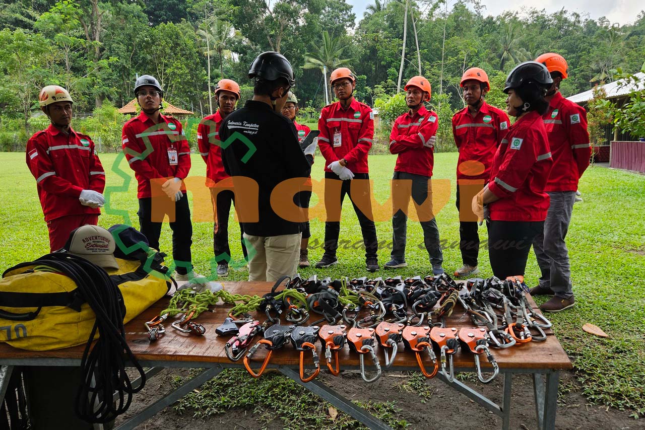 - menggunakan tali kermantle yang mempunyai elastisitas memanjang minimal 5% (Hrna persen) apabila terbebani Tenaga Kerja yang jatuh.